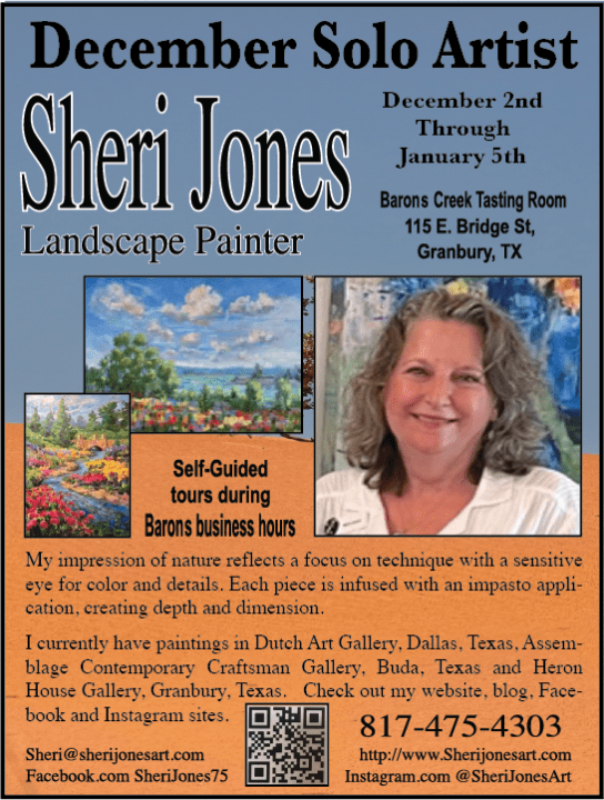 Barons Creek Vineyards is thrilled to usher in the holiday season with a spectacular December Solo Art Exhibit, showcasing the works of our Featured Artist, Sheri Jones. Known for her captivating landscapes, Sheri’s work features a unique oil painting technique and a stunning palette of colors that bring her creations to life.